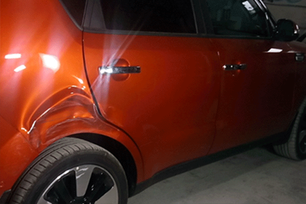 Автомобиль после удара в левое заднее крыло и дверь. Крыло - несъемная часть автомобиля. Рихтовка, окраска. Очень сложный цвет. Подбирался по автомобилю в несколько выкрасок, пока не получили нужный цвет. Металл был растянут, небольшая, но решаемая сложность.